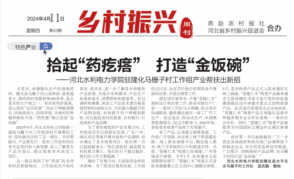 4月11日,《河北日报农村版·燕赵农村报》第5版以《拾起“药疙瘩” 打造“金饭碗”——金年会jinnianhuicom驻隆化马栅子村工作组产业帮扶出新招》为题,对金年会驻村工作组产业帮扶事迹进行专题报道。《河北日报农村版·燕赵农村报》原名《河北农民报》,于2021年6月更名,系河北日报报业集团旗下河北省委省政府指导全省农业农村工作的新闻舆论传媒机构,是党报党刊,创刊于1964年,前身《河北农民报》由毛泽东主席亲笔题写报名,是河北省内唯一面向农村发行的涉农类报刊。...