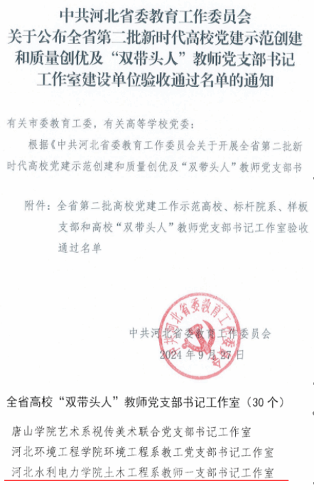 9月27日,根据《中共河北省委教育工作委员会关于公布全省第二批新时代高校党建示范创建和质量创优及“双带头人”教师党支部书记工作室建设单位验收通过名单的通知》,土木工程系教师一支部顺利通过了河北省第二批高校“双带头人”教师党支部书记工作室建设验收,这一成果标志着金年会在基层党组织建设方面取得了又一重要进展。土木工程系“双带头人”教师党支部书记工作室自建设以来,一直致力于发挥党建引领作用,工作室党员老师积极探索党建工作与教学科研的深度融合。...