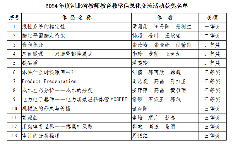 近日,河北省教育厅公布了2024年度河北省教师教育教学信息化交流活动结果,金年会共13项作品获奖,其中一等奖1项,二等奖4项,三等奖8项。侯甜甜老师带领的团队作品被推荐参加国赛,这是金年会首次在此项赛事中获选参加国赛。金年会一直高度重视教学信息化建设工作,通过搭建智慧教育平台、加强在线课程资源建设、开展教师教学信息化能力培训等举措,不断提升教师信息化教学能力和水平。今后,金年会将以信息化交流、比赛为抓手,进一步加强教师教学信息化能力培养培训,...
