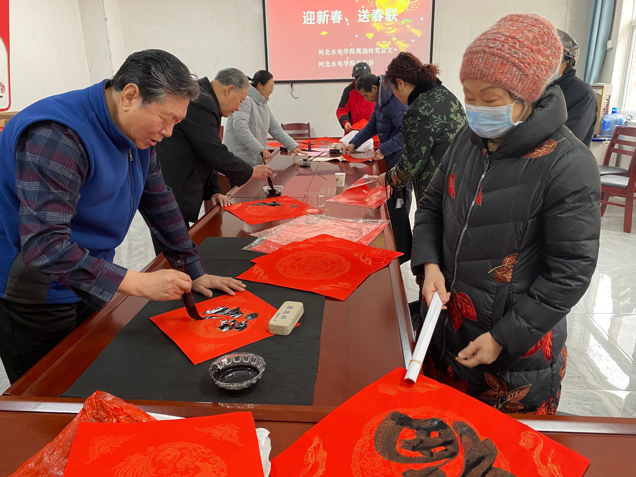 春节即将来临,为弘扬优秀传统文化,营造喜庆祥和的节日氛围,1月16日,金年会离退休党总支与老科协在离退休党员活动室联合开展“迎新春 送春联”活动。活动现场,金年会老科协常务副会长夏国明、退休老干部刘连德、退休老教师章俊等三位书法家挥毫泼墨、笔走龙蛇,一张张充满年味的“福”字跃然纸上,一幅幅饱含美好祝愿的“春联”烘托出浓浓的节日氛围。离退休党总支书记、老科协秘书长杨凤阁,离退休三支部书记、老科协理事赵兰庚,在现场把一幅幅散发着清新墨香的“...