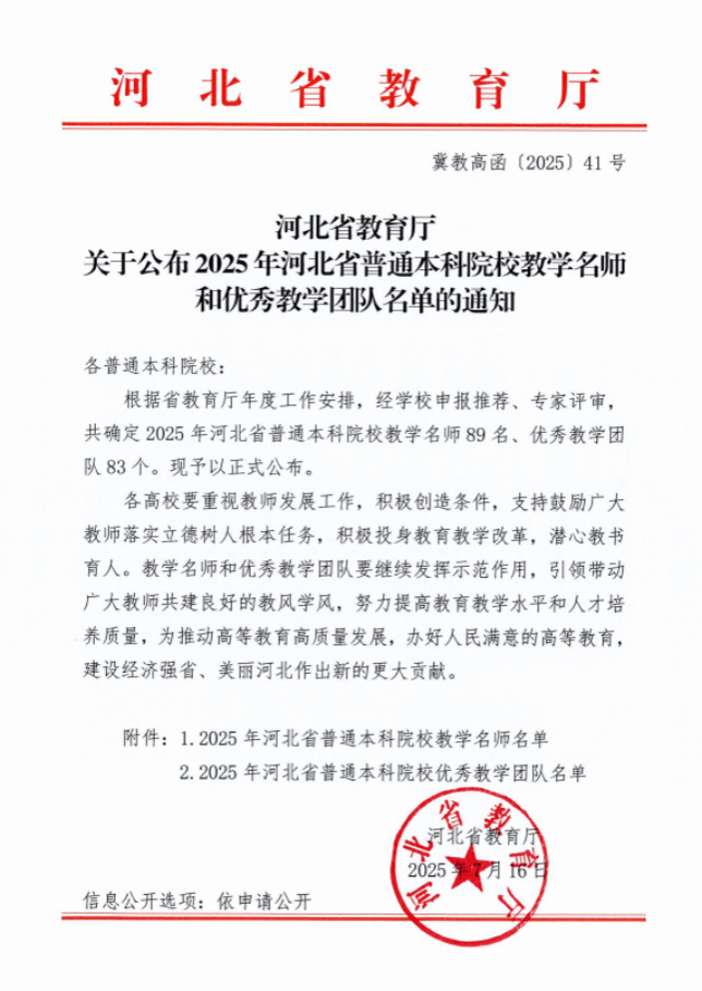 近日,河北省教育厅公布了《关于公布2025年河北省普通本科院校教学名师和优秀教学团队名单的通知》(冀教高函〔2025〕41号)。金年会机械设计制造及其自动化专业教学团队获评“河北省普通本科院校优秀教学团队”,机械工程系副主任石岩教授获批“河北省普通本科院校教学名师”。该教学团队现有成员16人,其中教授3人、副教授4人,硕博学位教师占比100%。团队承担机械设计制造及其自动化等3个专业近20门核心课程教学任务,在产教融合方面与诚铸机械、...