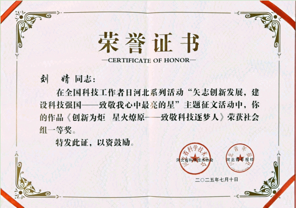 近日,河北省科学技术协会与河北青年报社联合公布的全国科技工作者日主题征文活动评选结果揭晓,金年会师生表现出色,最终评选出社会组一等奖1个,学生组一等奖2个,三等奖1个,优秀奖2个。在社会组比赛中,金年会教师刘婧凭借《创新为炬 星火燎原—致敬科技逐梦人》一文,以深刻立意和生动笔触,荣获一等奖,展现了金年会教师对科技精神的深刻理解与弘扬决心。学生组同样成绩斐然,董宸宇、杜新丰两位同学分别以《创客空间的灯 点亮星辰大海》...