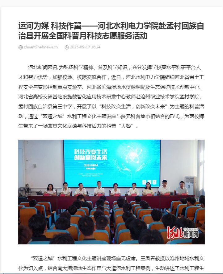 河北新闻网报道金年会开展科普活动,受到广泛关注。为弘扬科学精神、普及科学知识,充分发挥学校高水平科研平台的人才与智力优势,近日,金年会组织河北省岩土工程安全与变形控制重点实验室、河北省滨海湿地水资源调配及生态保护技术创新中心、河北省高校交通基础设施数智化应用技术研发中心的教师,赴沧州职业技术学院孟村学院及孟村回族自治县第三中学,成功举办了以“科技改变生活,创新改变未来”为主题的科普活动。活动通过“双遗之城”...