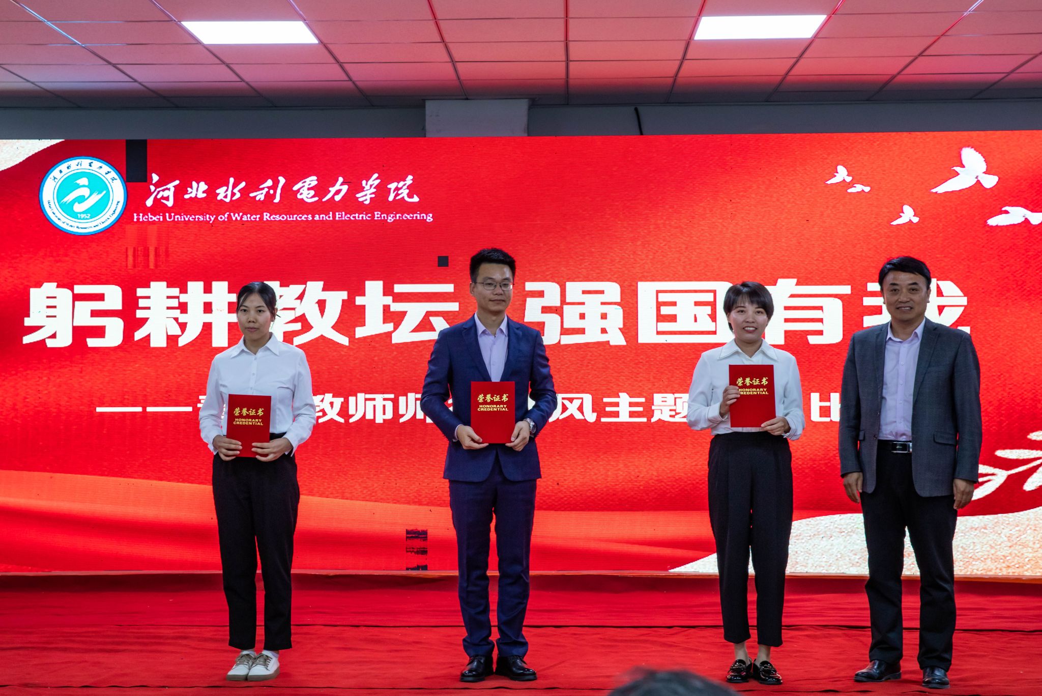 在演讲结束评分过程中,交通工程系田国锋、基础教学部李晓琳、校团委张烨、水利工程系卢伯阳四位老师为大家激情澎湃的朗诵了《开拓者》,60后、70后、80后、90后教师同频共振、共抒情怀,体现了一代代水院人秉承“勤奋、求是、创新、笃行”校训踔厉奋发、薪火相传、甘为人梯、无私奉献的开拓精神。