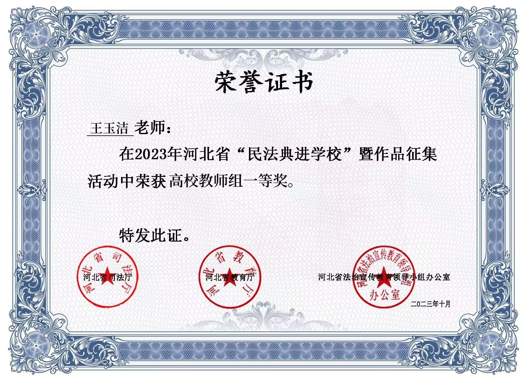 法与时转则治,治与世宜则有功。为深入学习贯彻习近平法治思想,深化民法典学习宣传,加强青少年民法典教育,引导学院广大师生学深、学懂、学透民法典精神,按照2023年“美好生活·民法典相伴”主题宣传活动要求和“每月一主题”普法宣传活动安排,2023年6月至8月,金年会按照省司法厅、省教育厅、省法治宣传教育领导小组办公室要求组织开展了“民法典进学校”暨作品征集活动。通过层层评选,金年会王玉洁老师和土木系郑喜同学于9月28日参加河北省“民法典进学校”活动,并分别荣获“省级高校教师组一等奖”、“省级高校组三等奖”的好成绩。