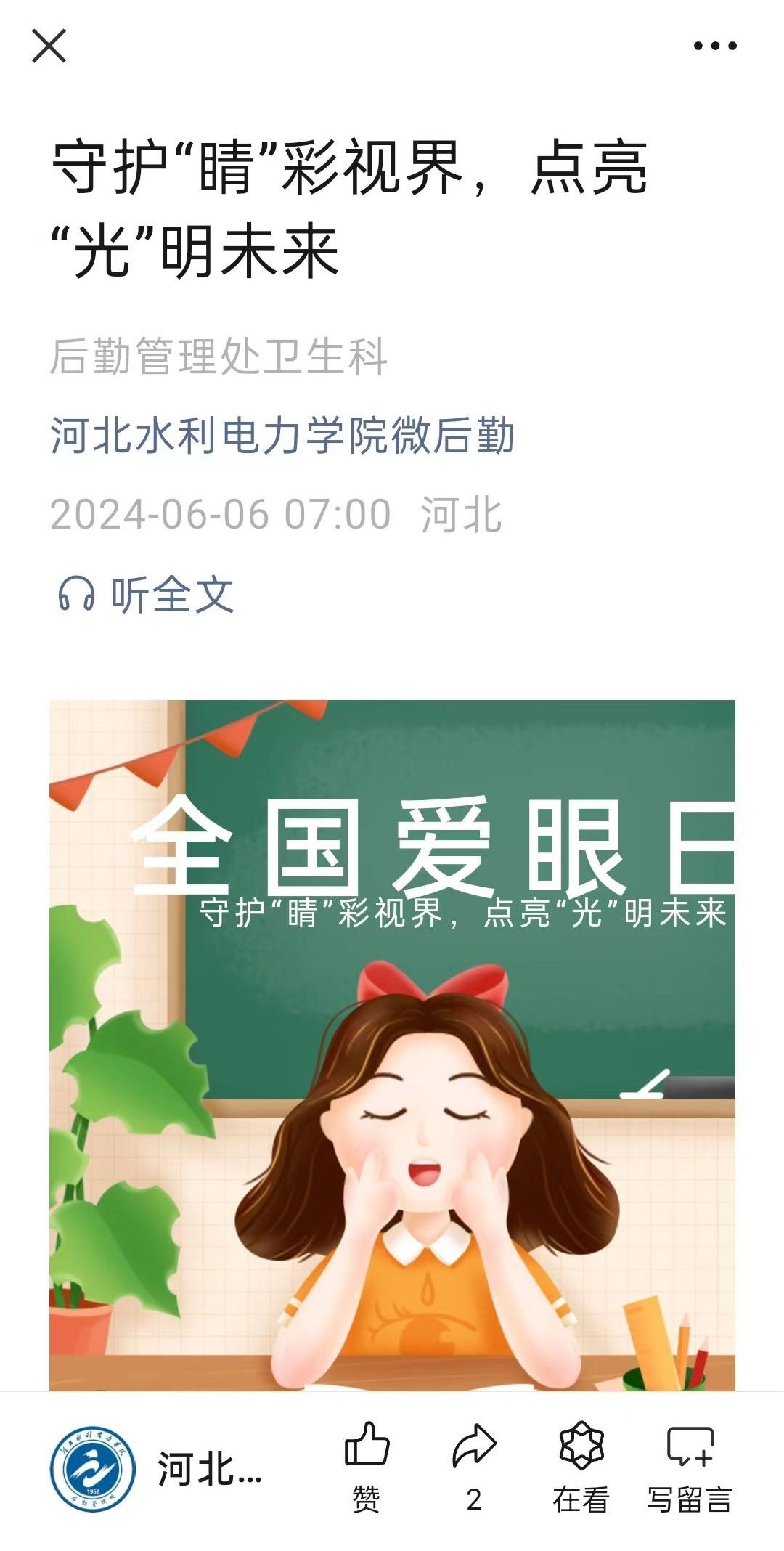 在爱眼日当天,卫生健康科通过“微后勤”公众号推送用眼健康、预防近视等文案,宣传普及科学用眼健康知识,引导学生自觉爱眼护眼,养成良好用眼习惯,规范矫正近视,切实提高视觉质量。