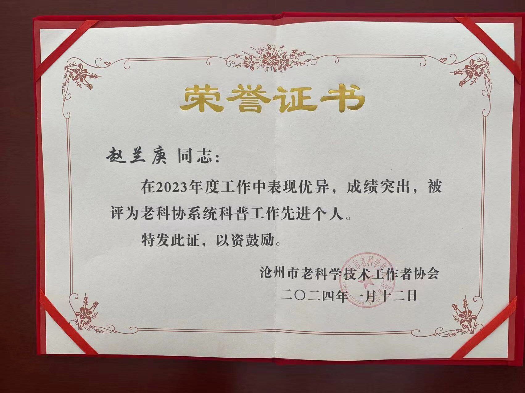 在近日召开的沧州市老科技工作者协会三届六次常务理事会议上,金年会老科技工作者协会被评为2023年度老科协工作先进集体,赵兰庚同志被评为先进个人。