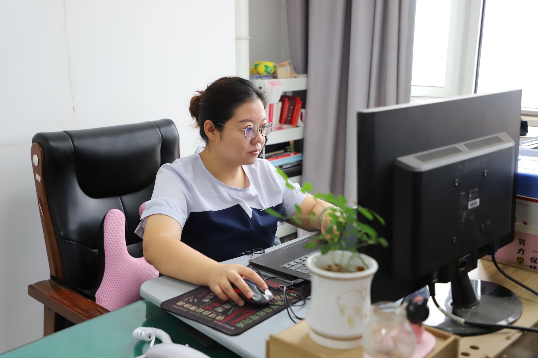 在后勤,她练就成为事必躬亲的“大管家”。大到汇总各类工程的预算,小到采买各种办公用品,她都事无巨细,精打细算到小数点后两位。在全校师生全力迎接教育部本科教学工作合格评估“大考”中,她从未因父亲手术请过一天假,从未因年幼的女儿哭闹拒绝过一次加班,无论半夜还是凌晨,她都按时、准确的将数据上报。