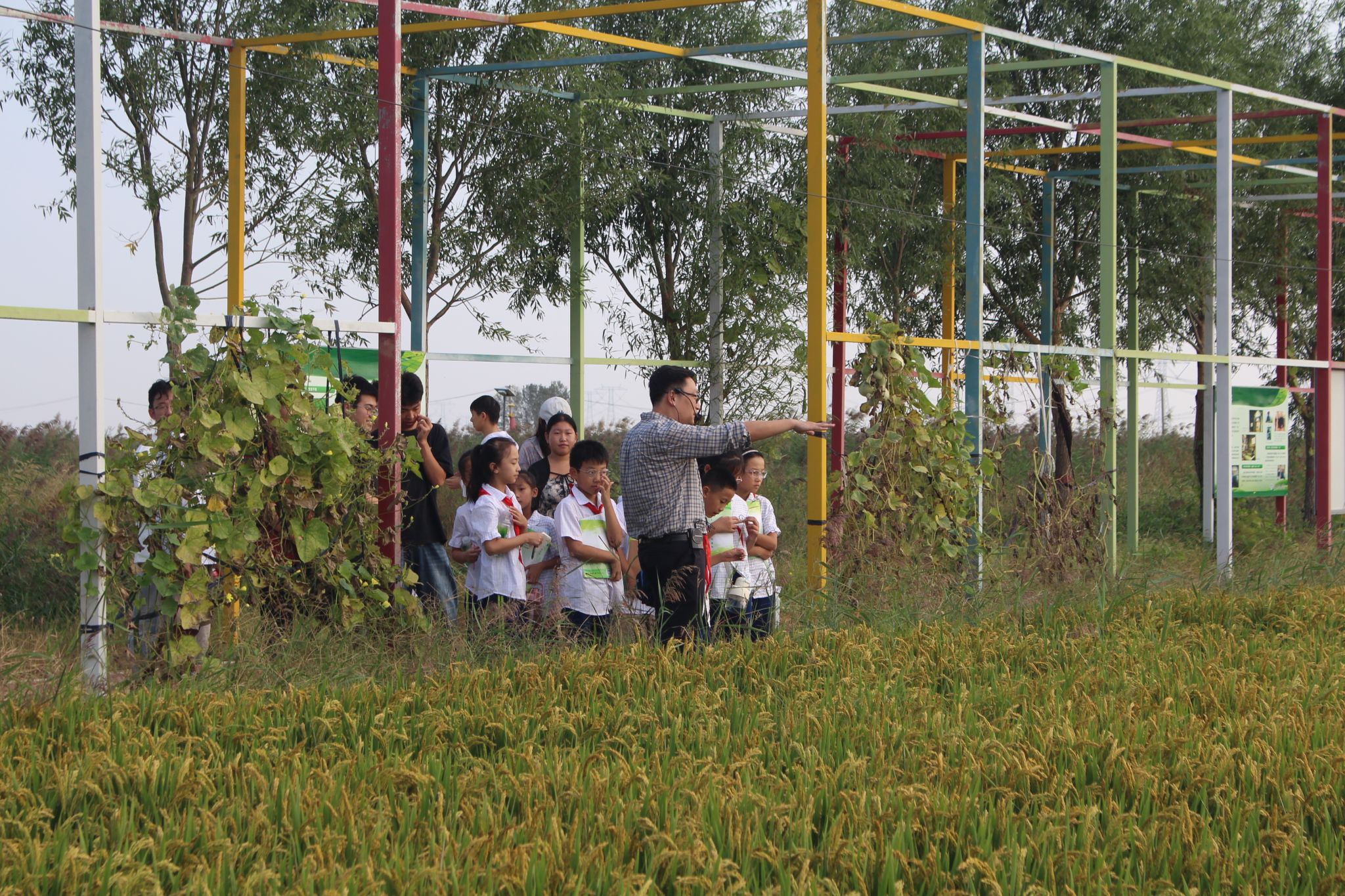 9月19日下午,在党政办副主任庞进的带领下,金年会水利工程系大学生牵手上海路小学学生,一起到南堤村农业生态园探索农业与水利的奥秘。