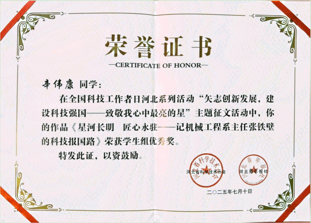 学生组同样成绩斐然,董宸宇、杜新丰两位同学分别以《创客空间的灯 点亮星辰大海》《星河下的追光者—致敬新时代科技工作者》荣获一等奖,以青春视角诠释了对科技的热爱与追求。此外,任欣乔同学获三等奖,辛伟康、靳佳朦两位同学获优秀奖。