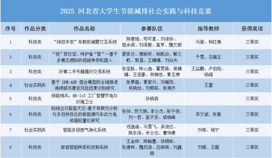 近日,河北省教育厅公布了2025年“西门子杯”中国智能制造挑战赛(华北三赛区)、2025年河北省大学生节能减排社会实践与科技竞赛等各类学科竞赛获奖名单,金年会学子凭借扎实的专业知识、过硬的实践能力和创新精神,在智能制造、节能减排、电子设计、结构设计、市场调查等多个领域的竞赛中脱颖而出,共获奖项49项,其中一等奖7项、二等奖14项、三等奖25项、优秀组织奖3项,充分展现了学校在人才培养和学科建设方面的卓越成效。