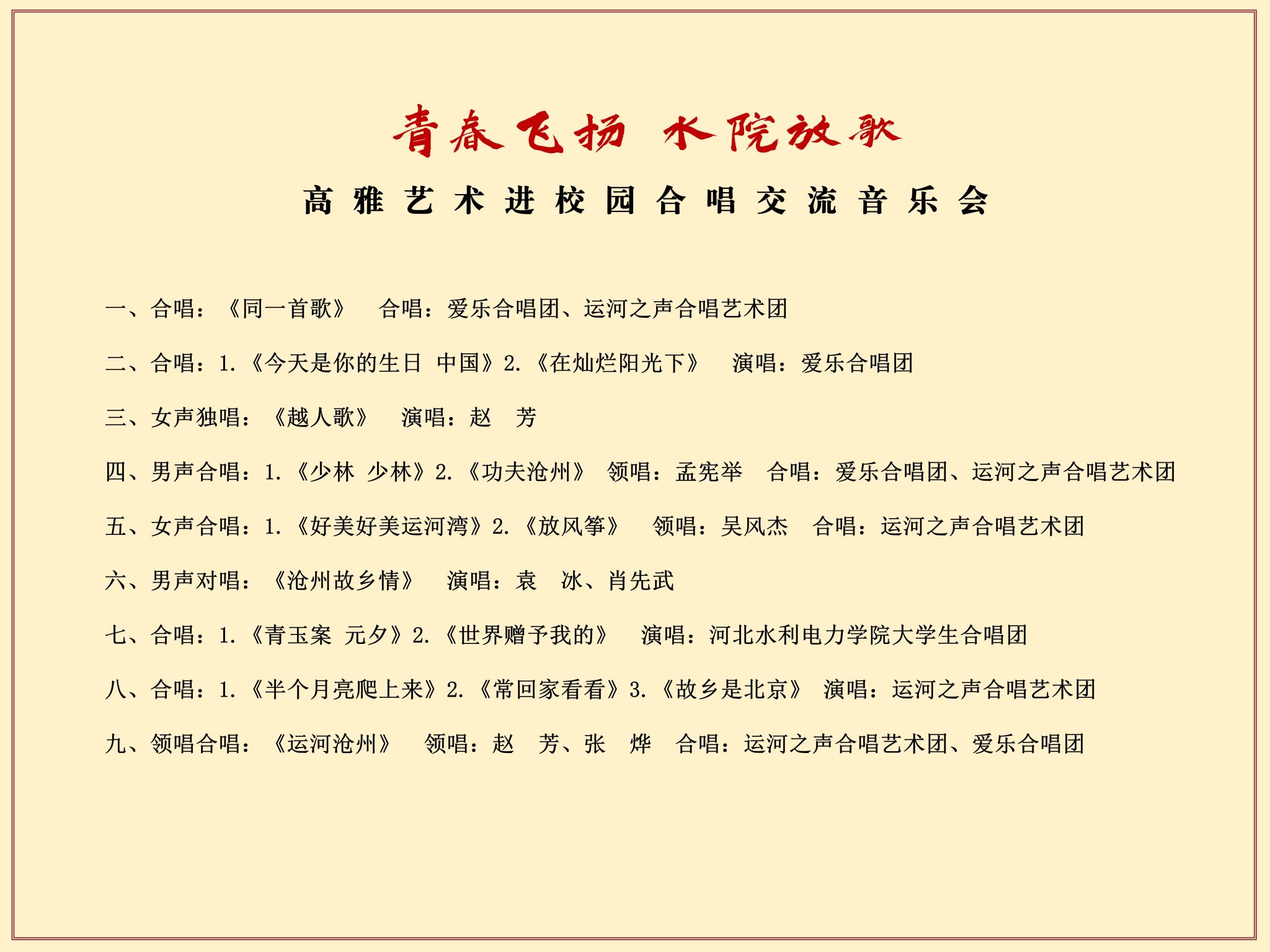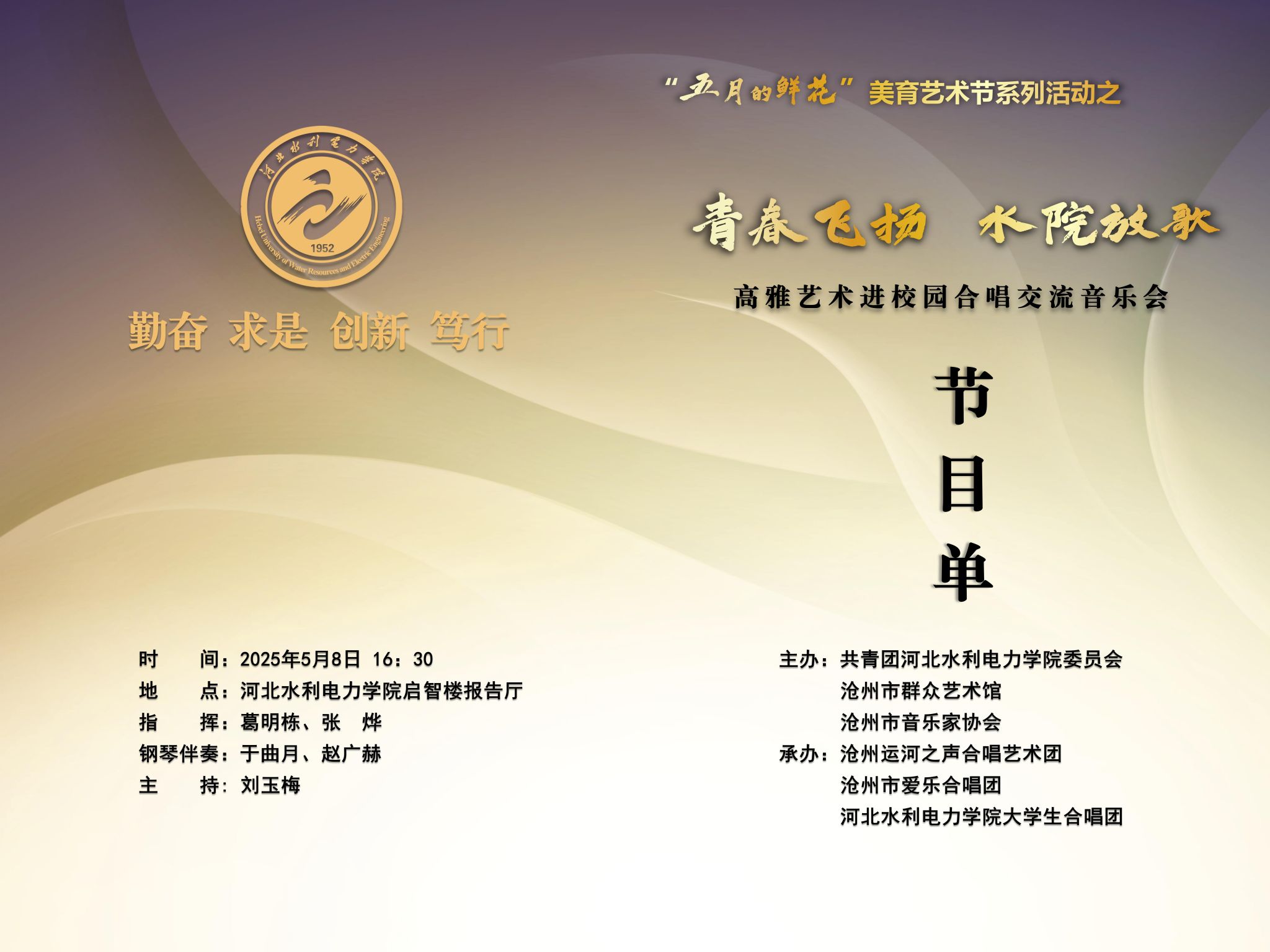 为深入学习贯彻党的二十大精神,进一步加强金年会美育工作,创建美育特色品牌,全面提升校园文化建设水平,校团委联合沧州市群众艺术馆、沧州市音乐家协会等单位,举办“五月的鲜花”美育艺术节系列活动,包括合唱交流音乐会、红歌展演、书画展览、舞蹈赏析、美育讲座等内容。现将首场演出——校园合唱交流音乐会演出节目单通知如下,欢迎广大师生踊跃参加。